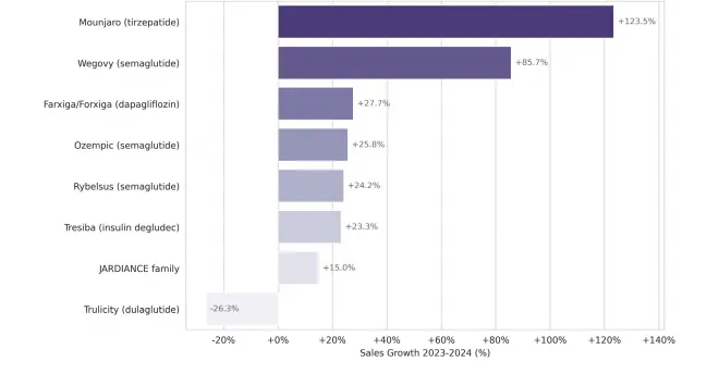 《制药50》显示,SGLT2家族药物在治疗心衰、慢性肾脏病上维持竞争力,2024年全年增长在15%-28%区间。但GLP-1明星家族,凭借更强心肾保护作用,正在逐步“掠地”。