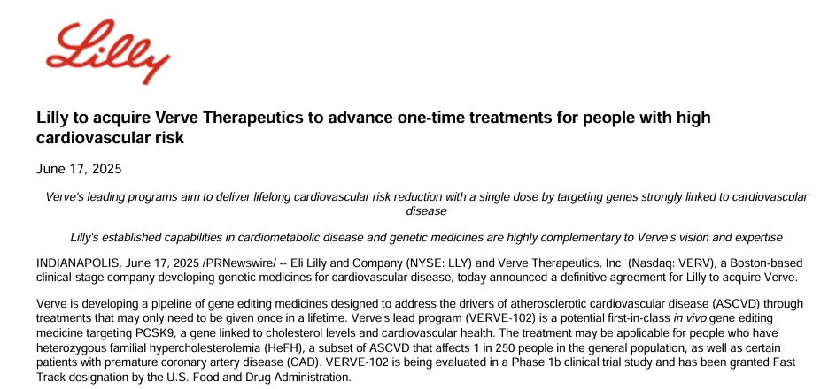 昨日(2025年6月17日),礼来宣布正式以13亿美元的价格收购Verve Therapeutics。