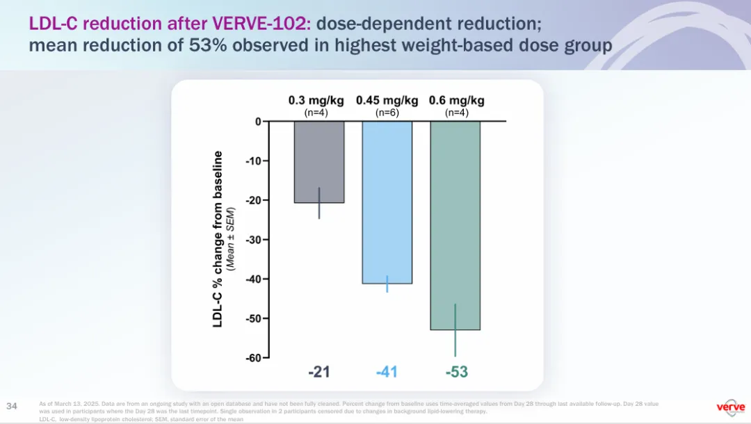 在安全性事件上,VERVE-102也没有出现与治疗相关的严重不良反应,没有剂量限制性毒性,也没有心血管事件。而这种不良反应没有出现剂量依赖性变化的结果,为VERVE-102提供了广泛的治疗指数。
