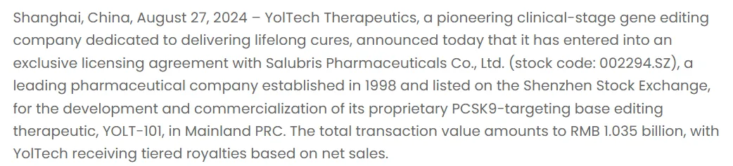 几乎与礼来-Verve合作模式遥相呼应,中国基因编辑领域在2024年8月上演了一场精彩的本土化合作案例——尧唐生物与信立泰就YOLT-101项目达成总额10.35亿元的授权协议。这一交易不仅创造了国内基因编辑领域的里程碑,更揭示出中外企业在基因编辑商业化策略上的殊途同归。