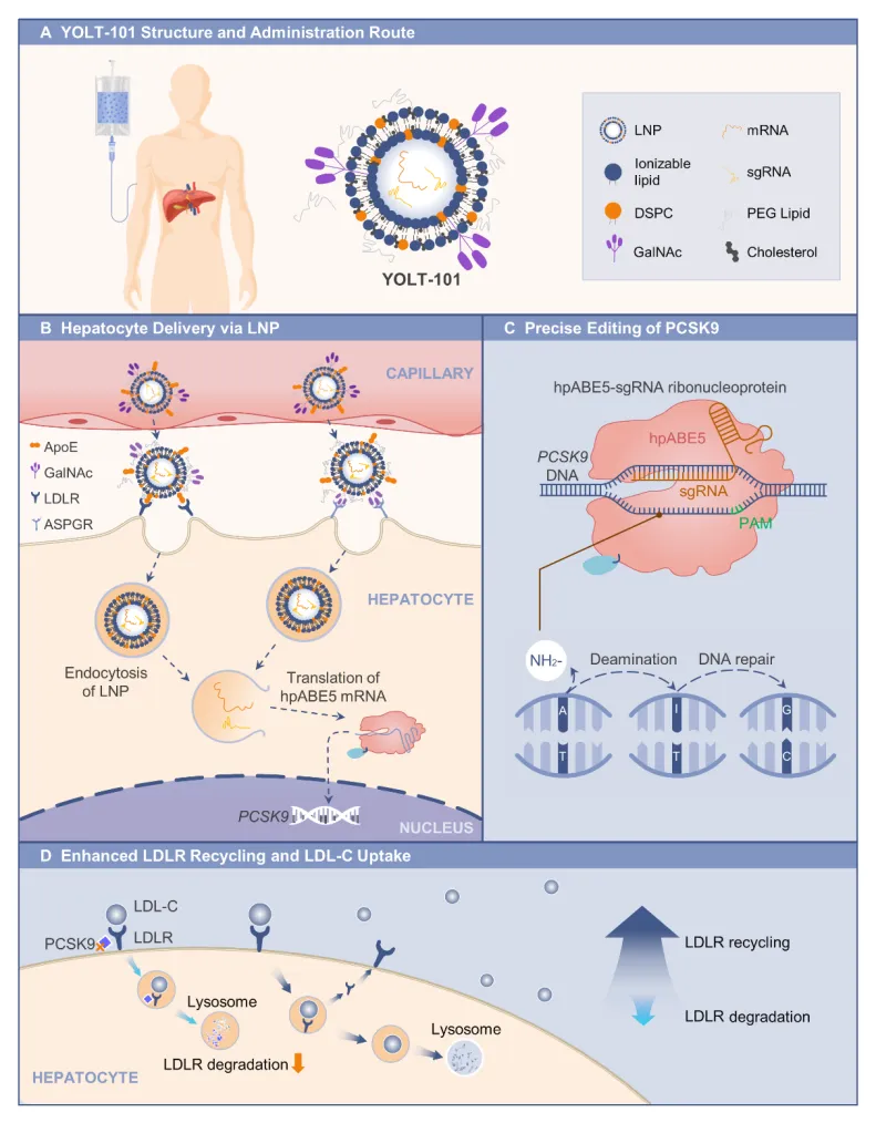 这一合作的战略逻辑与礼来-Verve联盟惊人相似。信立泰作为深耕慢病领域的龙头企业,已构建了一整套慢病创新药矩阵,而尧唐生物凭借其自主专利的碱基编辑器(YolBE®)和新型脂质纳米颗粒(YOL-LNPs®)递送载体技术,可以在DNA单碱基水平上精准编辑PCSK9基因,高效降低靶蛋白表达,兼具有效性和安全性,为高胆固醇血症提供“一针治愈”的可能,进一步将信立泰的优势外延。