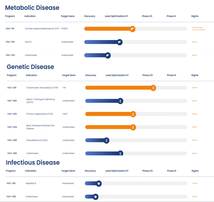尧唐生物的技术实力不仅体现在YOLT-101一个项目。作为中国体内基因编辑的领军企业,尧唐已构建起丰富且具国际竞争力的研发管线。目前已有4条管线进入临床阶段,为全球拥有临床阶段体内基因编辑管线最多的生物医药公司。