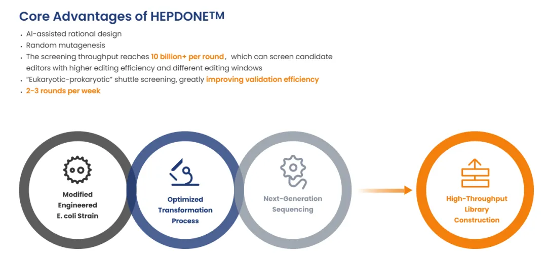 其中HEPDONE致力于挖掘、筛选和进化出国际领先、具备自主知识产权的全新编辑工具,能够根据不同疾病和基因靶点的差异性需求进行定向进化,目前已得到多个系列的全新编辑器。
