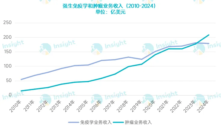 2024 年,强生肿瘤业务年度销售额首次突破 200 亿美元大关,创收 207.81 亿美元,首度超越自免(178.28 亿美元),成为强生创新药收入的第一大来源。