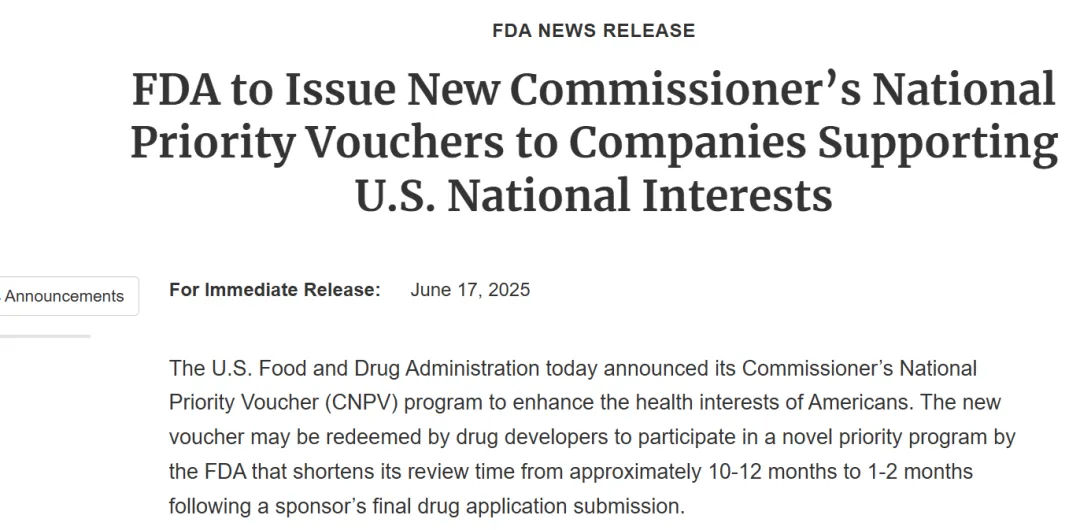 2025年6月17日,美国食品药品管理局(FDA)宣布推出“局长国家优先审批券”(CNPV)计划,旨在提升美国民众的健康权益。