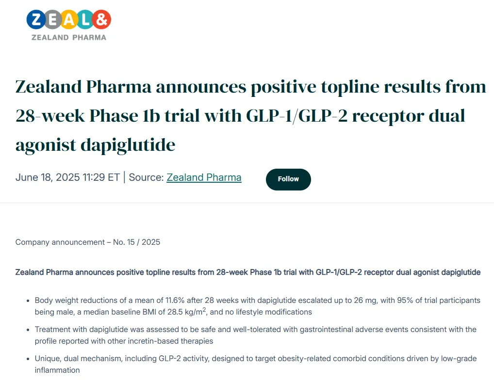 2025年6月18日,丹麦制药公司Zealand Pharma宣布其开发的GLP-1/GLP-2受体双重激动剂dapiglutide在减重领域的研究取得了积极进展。其 1b 期多次递增剂量(MAD)试验第二部分的顶线临床结果呈阳性。该试验旨在研究长效 GLP-1/GLP-2 受体双重激动剂 dapiglutide 治疗 28 周的安全性、耐受性和临床效果。
