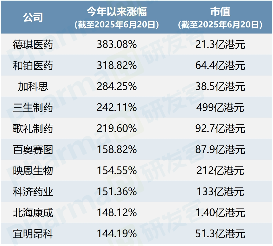 • 德琪医药今年以来股价涨幅最大,信达和百利天恒突破千亿市值;