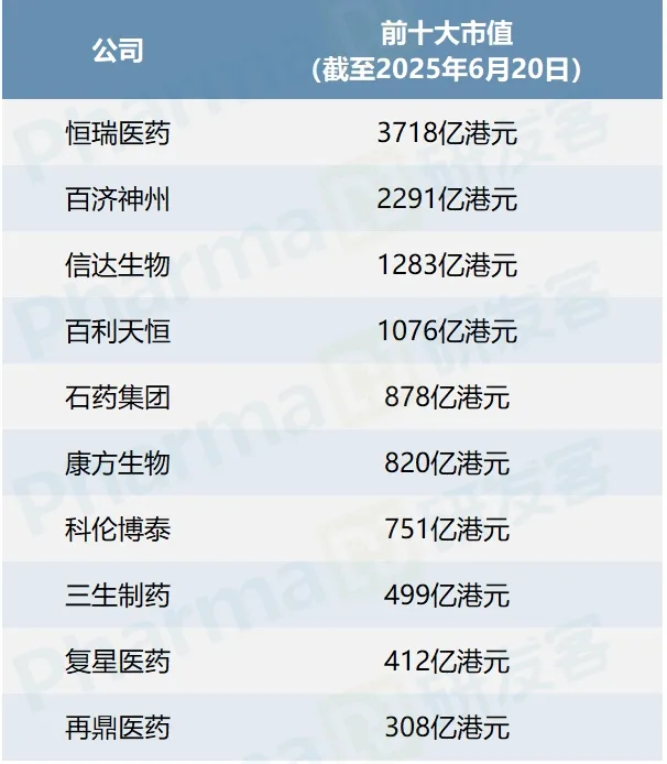 抛开恒瑞和百济两个领头羊,截至6月20日,另有两家企业突破千亿市值:信达生物以1283亿港元排在市值榜第三,紧随其后的百利天恒市值1076亿港元。(见下图)