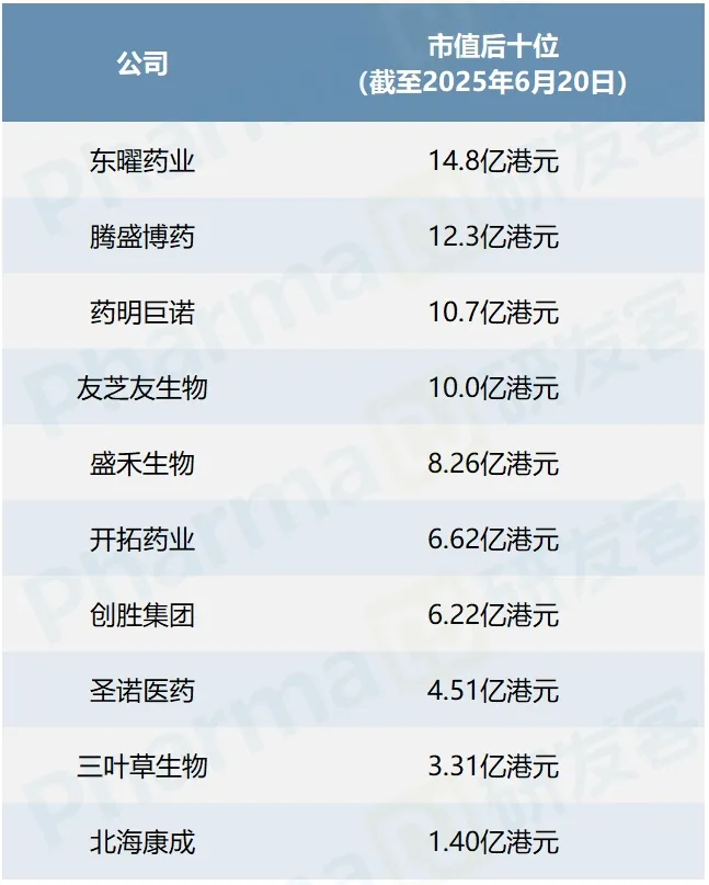 目前港股市值最低的十家公司里,腾盛博药赫然在列(见下图)。腾盛博药在新冠疫苗和中和抗体停产之后,无新产品接力,2024年业绩亏损进一步扩大至5.12亿元。