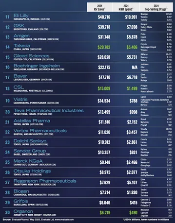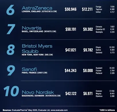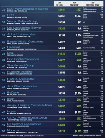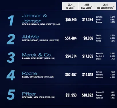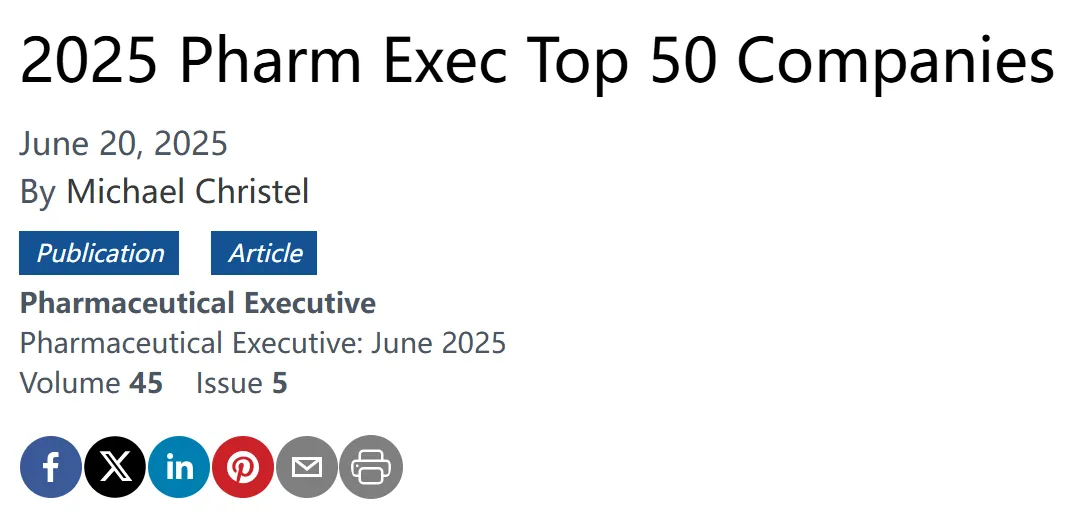 2025年6月20日,全球知名行业媒体Pharmaceutical Executive(制药经理人)公布了一年一度的全球制药企50强榜单,2025 Pharm Exec Top 50 Companies,该榜单根据处方药销售额对全球前50名药企进行排序,在行业的影响力很大。