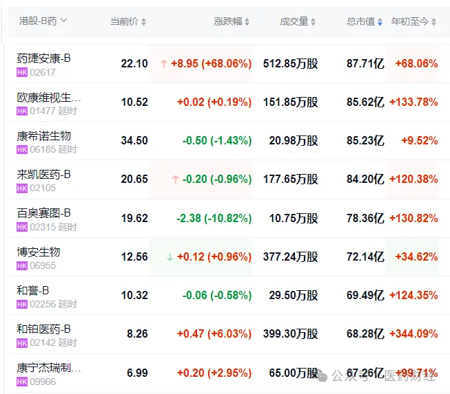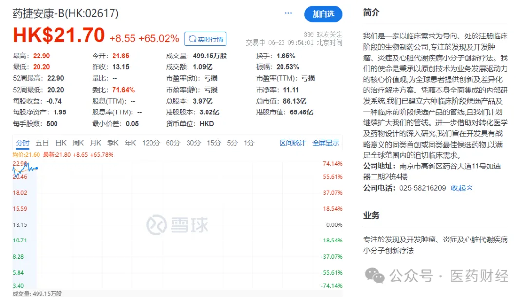上市当日,药捷安康股价盘中一跃涨幅超60%,市值突破80亿港元,在港股18A中市值排名第17位,高于欧康维视、康希诺生物、百奥赛图等公司。
