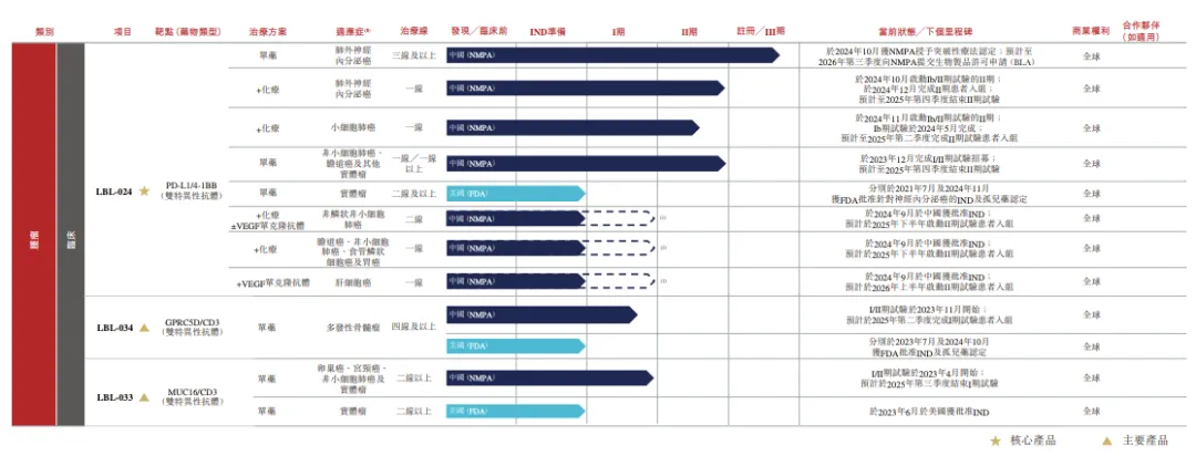 除核心产品外,其内部亦有:(i)5款其他临床阶段候选药物(LBL-034、LBL-033、LBL007、LBL-019及LBL-015);及(ii)8款额外临床前阶段候选药物(LBL-043、LBL-049、LBL-054-TCE、LBL-054-ADC、LBL-061、LBL-058、LBL-051及LBL-047)。