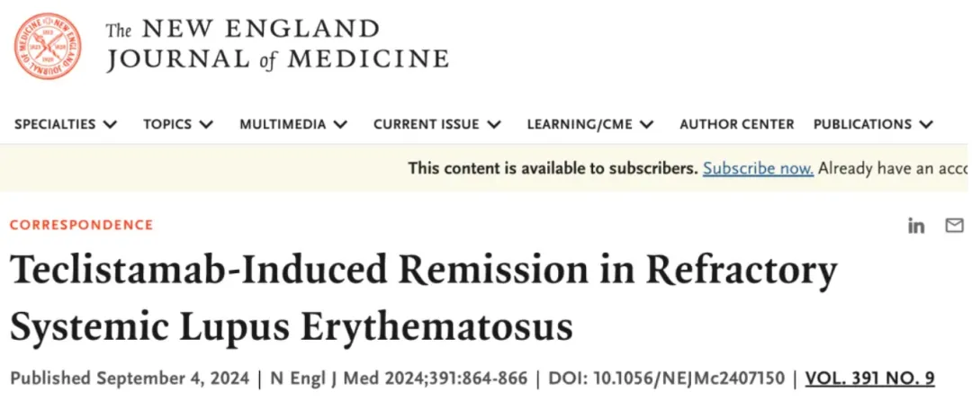 2024年9月,《新英格兰医学杂志》发表的一篇研究数据显示,一名有6年病史的SLE患者在接受BCMAxCD3双抗Teclistamab治疗后能够快速且在无药物维持的情况下,生物标志物降至正常或接近正常水平,患者粘膜皮肤和肌肉骨骼症状完全消失,实现了完全缓解。