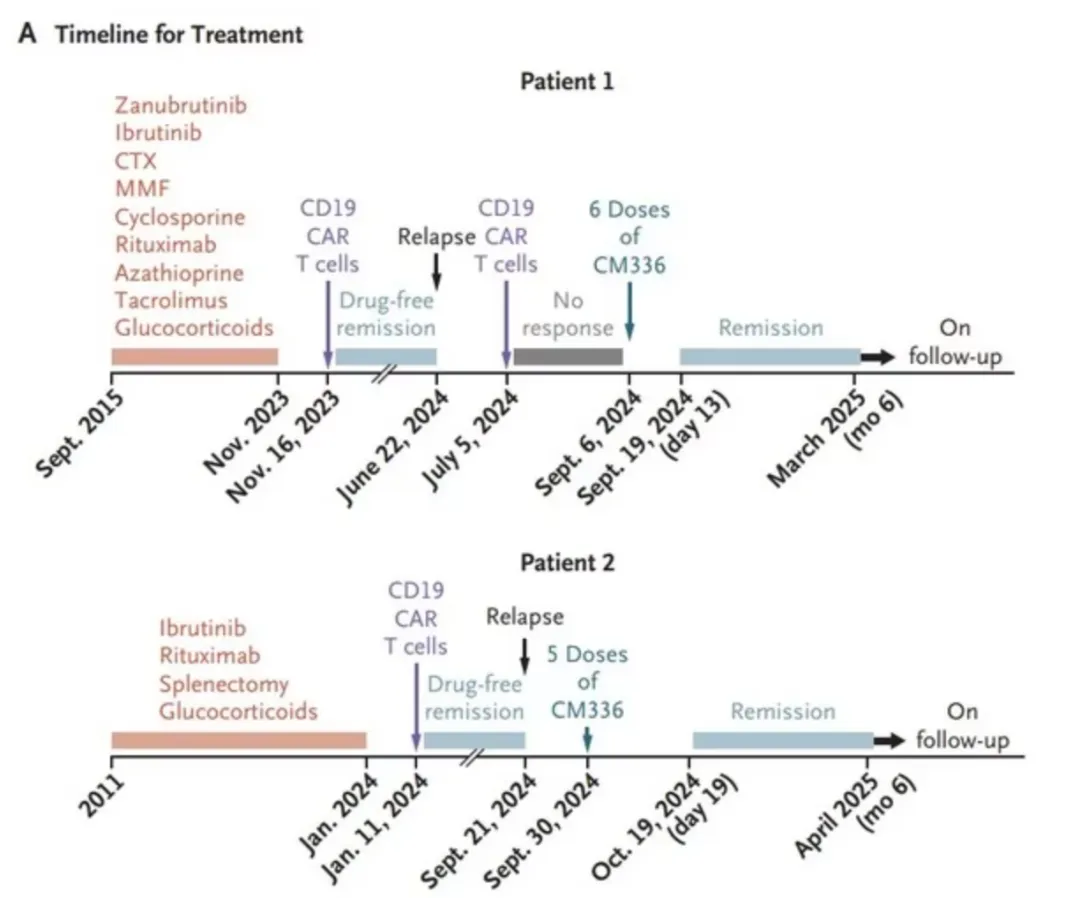 同样在NEJM,康诺亚最新发布的BCMAxCD3双抗CM336在自身免疫性溶血性贫血(AIHA)数据加了一把火,在两名多线治疗失败(包括CD19 CAR-T、BTK抑制剂)的AIHA患者中,两名患者在接受治疗后分别在第13天获得部分缓解(PR)、在第21天获得完全缓解(CR),并且疗效持续超过半年;安全性方面,仅观察到1级皮肤硬结及低丙球蛋白血症,没有发生严重不良反应,亦未出现CRS或ICANS,未见感染事件。