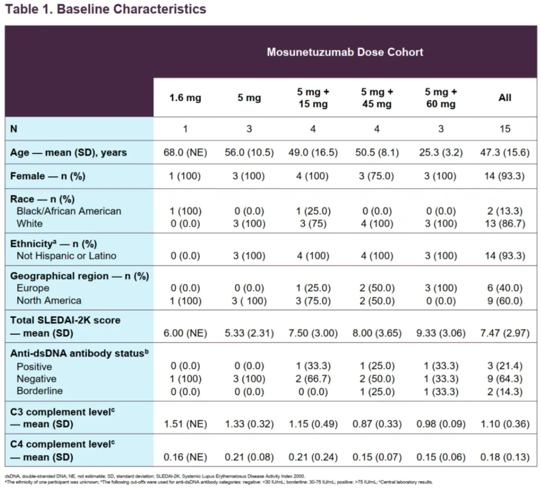 Mosu在EULAR 2025大会上公布了治疗系统性红斑狼疮(SLE)的1b期的结果,该研究一共纳入了15名成年SLE患者,筛查时系统性红斑狼疮疾病活动指数 2000(SLEDAI-2K)总分≥4,为中度SLE患者,试验分为2个剂量探索队列(非分割,21天)和3个剂量递增队列(分割,28天),所有患者在完成最后一次治疗后须至少随访12个月监测安全性。