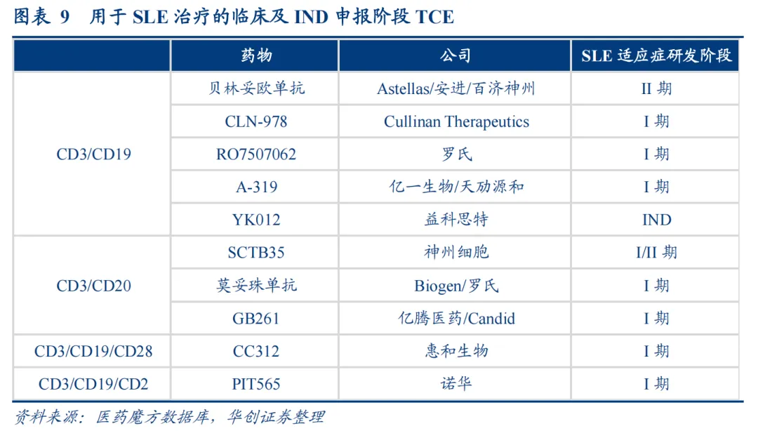 全球TCE自免管线资产超过30款,但大部分都在临床前,而光是治疗SLE进入临床的TCE管线就超过10条,而这些管线将在未来2年内密集披露数据。