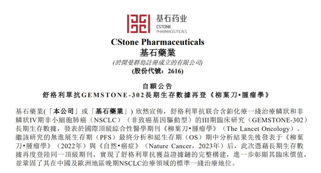 6月19日,基石药业(2616.HK)宣布,舒格利单抗(商品名:择捷美®)联合含铂化疗一线治疗鳞状和非鳞状IV期非小细胞肺癌(NSCLC)的III期临床研究(GEMSTONE-302)长期生存数据在国际顶级期刊《柳叶刀·肿瘤学》正式发表。