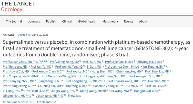 这是继该研究的无进展生存期(PFS)最终分析(2022年)和总生存期(OS)期中分析(2023年)先后发表于《柳叶刀·肿瘤学》与《自然·癌症》后,第三次登上国际顶级学术舞台,标志着舒格利单抗在晚期肺癌治疗领域获益证据链的完整构建。