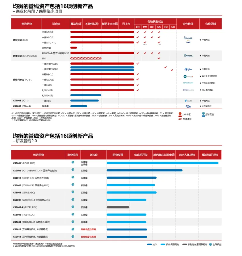 基石药业目前已建立丰富的研发管线,包含16款候选药物,涵盖抗体偶联药物(ADC)、多特异性抗体、免疫疗法及精准治疗药物。公司已成功上市4款创新药,获批16项新药上市申请(NDA)及9项适应症。