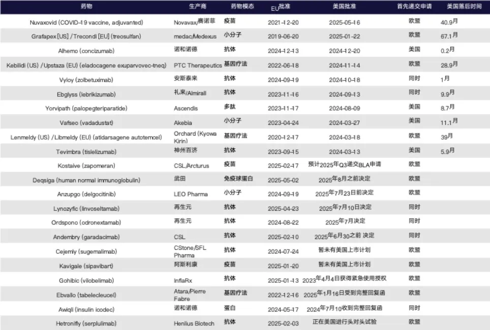 以典型案例来看,Novavax的COVID-19疫苗Nuvaxovid早在2021年底就已获得欧盟批准,美国直到2025年5月才完成正式批准,时间滞后超过40个月;medac/Medexus的Grafapex(treosulfan)在欧盟于2019年获批,美国则在2025年初才通过,滞后长达67个月。类似的还有Atara的Ebvallo(tabelecleucel),其在2022年即获欧盟上市许可,至2025年仍未获得FDA批准,反而收到CRL,主要因制造流程未满足FDA对一致性和GMP的高标准要求。