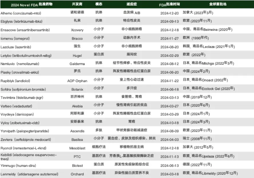 表 2. 非美国首次上市的FDA 2024年批准新药