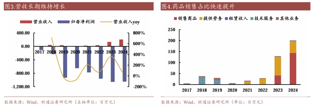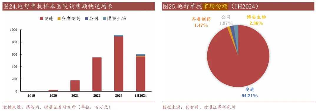 万元,同比增长243.53%和149.77%。目前公司在市产品中最大的增长来源于地舒单抗,2024年收入为1.39亿,占全年药品销售收入的95.86%。