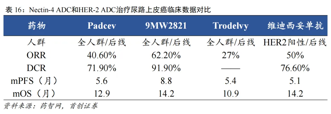 在2024年公布9MW2821单药治疗晚期后线UC的I/II期临床研究中,1.25 mg/kg剂量组的客观缓解率(ORR)为62.2%,疾病控制率(DCR)为91.9%,中位无进展生存期(mPFS)为8.8个月,中位总生存期(OS)为14.2个月。