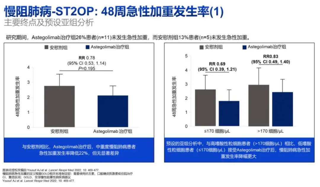 ST2单抗相对于已获批COPD的IL4Rα度普利尤单抗和IL-33单抗有差异化优势:度普利尤单抗只适用于2型炎症的慢阻肺患者(血嗜酸性粒细胞≥300个细胞/μL),而IL-33单抗itepekimab则目前暂时被证明对过往吸烟史患者有效,ST2单抗更差异化针对低嗜酸性粒细胞COPD人群(流行病学显示COPD以嗜酸性粒细胞计数小于300个细胞/μL的患者居多,而一项研究显示这类患者约占COPD总人数的31%)。