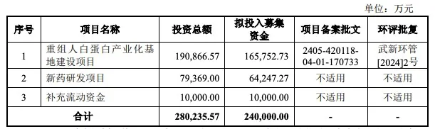 禾元生物在招股书中表示,本次发行拟募集资金240,000.00万元,其中165,752.73万元计划用于重组人白蛋白的产业化基地建设,64,247.27万元计划用于在研产品的未来研究开发。