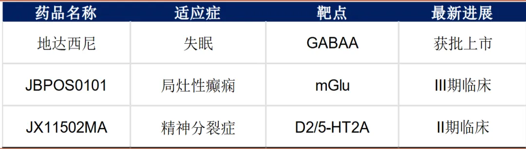 京新药业从首仿药(左乙拉西坦、舍曲林)转向创新,失眠新药地达西尼获批上市,精神分裂药物JX11502MA II期临床接近尾声,其与韩国 P-BS 公司合作的针对局灶性癫痫发作的新药 JBPOS0101步入 III 期临床(图2);