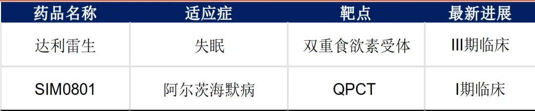此外,先声药业通过license in 补强自身 CNS 管线,其与瑞士Idorsia合作引进抗失眠的双重食欲素受体拮抗剂Daridorexant,并与Vivoryon合作推进用于治疗阿尔茨海默病的靶向谷氨酰胺酰基环化酶(QPCT)口服小分子抑制剂SIM0408的开发(图3);