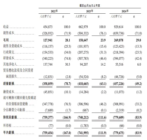 财务方面,镁伽科技2022年至2024年,收入由人民币454.9百万元飙升至人民币929.6百万元,复合年增长率为43.0%。同时,其维持健康稳定的毛利率,由2023年的约23.9%增至2024年的29%。2022年、2023年及2024年,其分别产生年内亏损人民币759.5百万元、人民币742.0百万元及人民币779.7百万元。