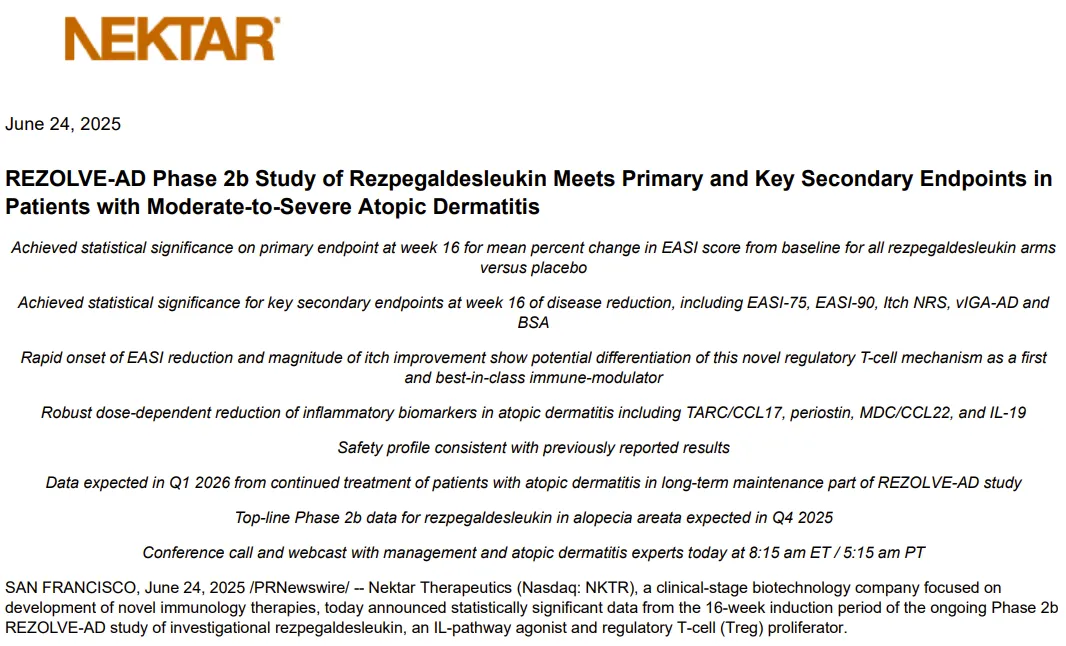 2025年6月24日,Nektar Therapeutics宣布IL-2类新药Rezpegaldesleukin治疗中至重度特应性皮炎的2b期临床达到主要终点和关键次要终点。