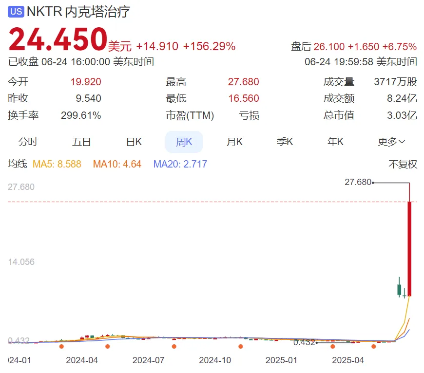 受此消息影响,Nektar Therapeutics当天股价大涨156%,目前市值为3亿美元。