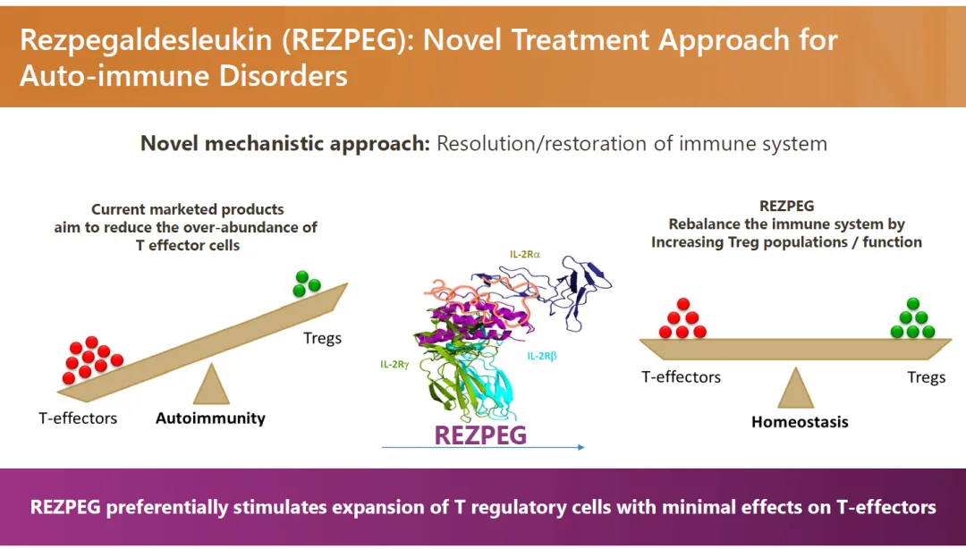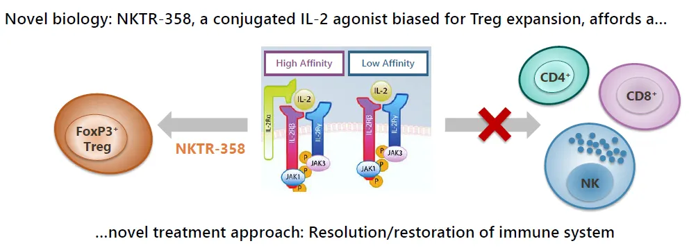 Rezpegaldesleukin为一种偏向性IL-2,经过改造对IL-2Rα的亲和力更高(NKTR-214对IL-2Rβ/γ的亲和力更高),可以促进Treg的增殖,而抑制效应T细胞的增殖。