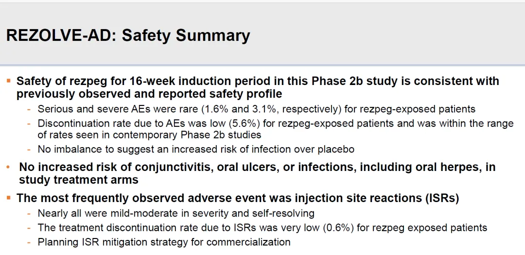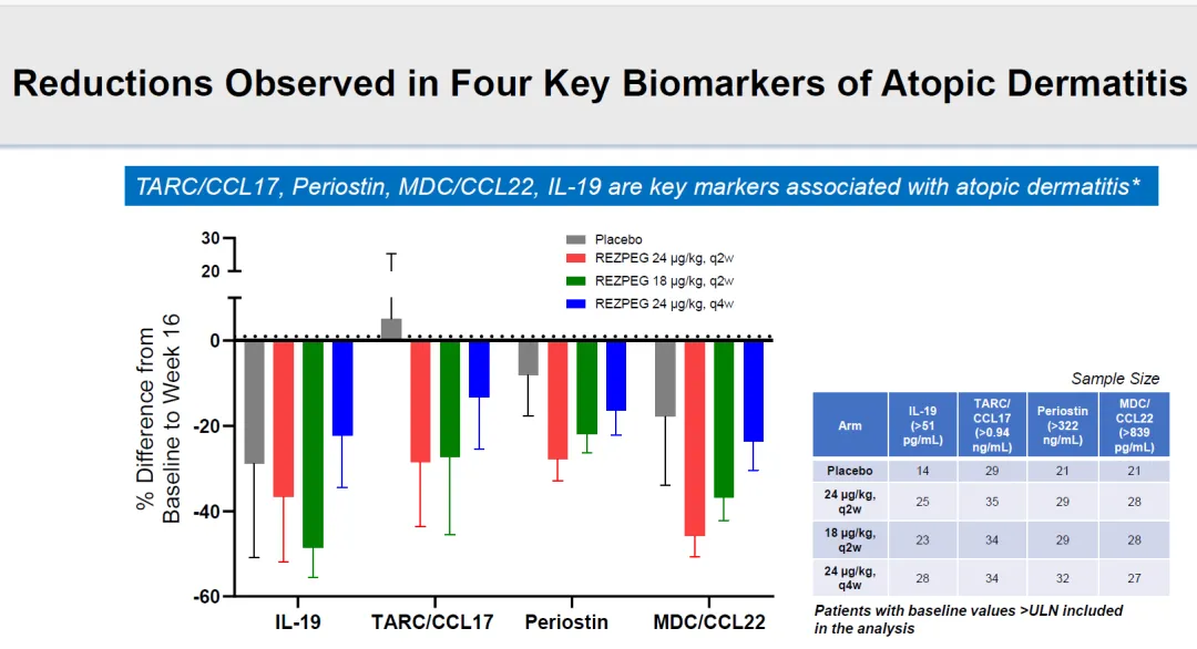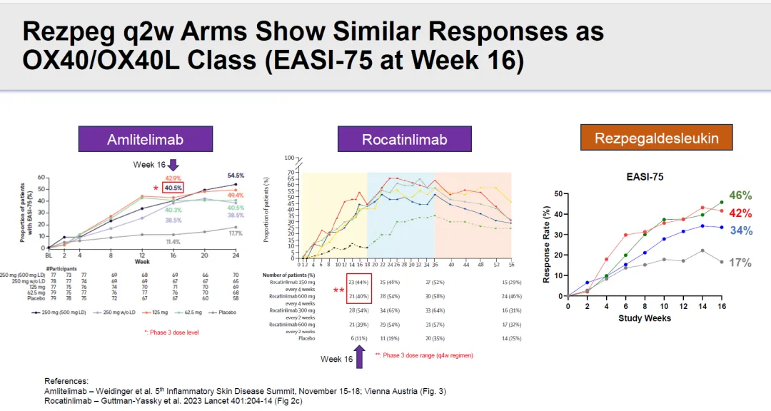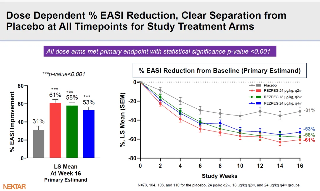 不同剂量组Rezpegaldesleukin治疗16周,EASI下降幅度分别为61%、58%、53%。