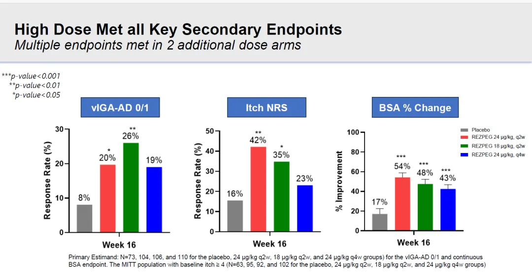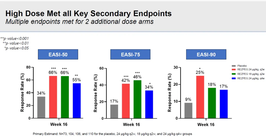 24ug Q2W剂量组的EASI-50、EASI-75、EASI-90分别为66%、42%、25%,均达到统计学显著改善。