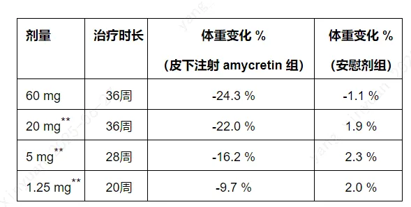 已发表和报告的每周一次皮下注射amycretin的1b/2a期临床试验结果显示,与安慰剂相比,接受amycretin治疗的所有受试者剂量组均显示出更大的体重降幅。在ADA会议上报告的数据来自试验的两部分;递增剂量(amycretin