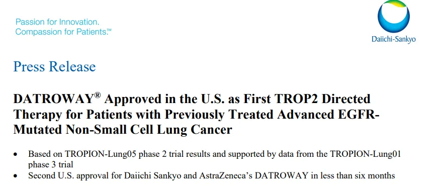 第一三共和阿斯利康正在 TROPION-Lung14 和 TROPION-Lung15 三期临床试验中,评估 DATROWAY 单药治疗和/或与阿斯利康的 EGFR 酪氨酸激酶抑制剂奥希替尼联合治疗其他晚期或转移性 EGFR 突变非小细胞肺癌的疗效。