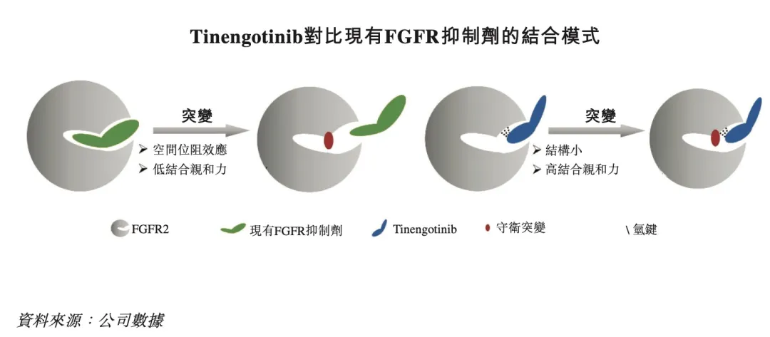 它与FGFR2的铰链区形成了3个氢键,而上一代药物通常只有1-2个,这使其结合亲和力高出近两个数量级 。
