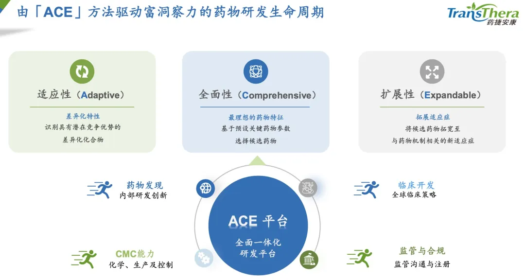这三大机制的背后,是药捷安康的“ACE”研发平台——即适应性(Adaptability)、全面性(Comprehensiveness)和扩展性(Extensibility)