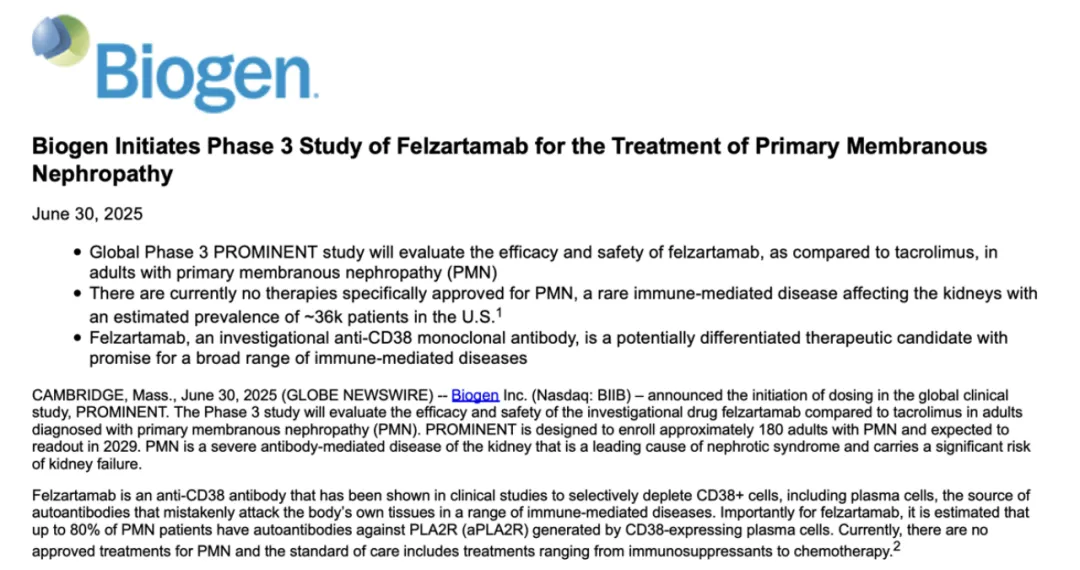 6月30日,Biogen发布公告,宣布felzartamab(中文通用名:菲泽妥单抗)治疗原发性膜性肾病(PMN)的全球三期研究PROMINENT(NCT06962800)已完成首例患者给药。这意味着,继AMR的TRANSCEND研究(NCT06685757)和IgAN的PREVAIL研究(NCT06935357)之后,这款CD38抗体在自免肾病领域的三项全球三期临床试验已全面启动。