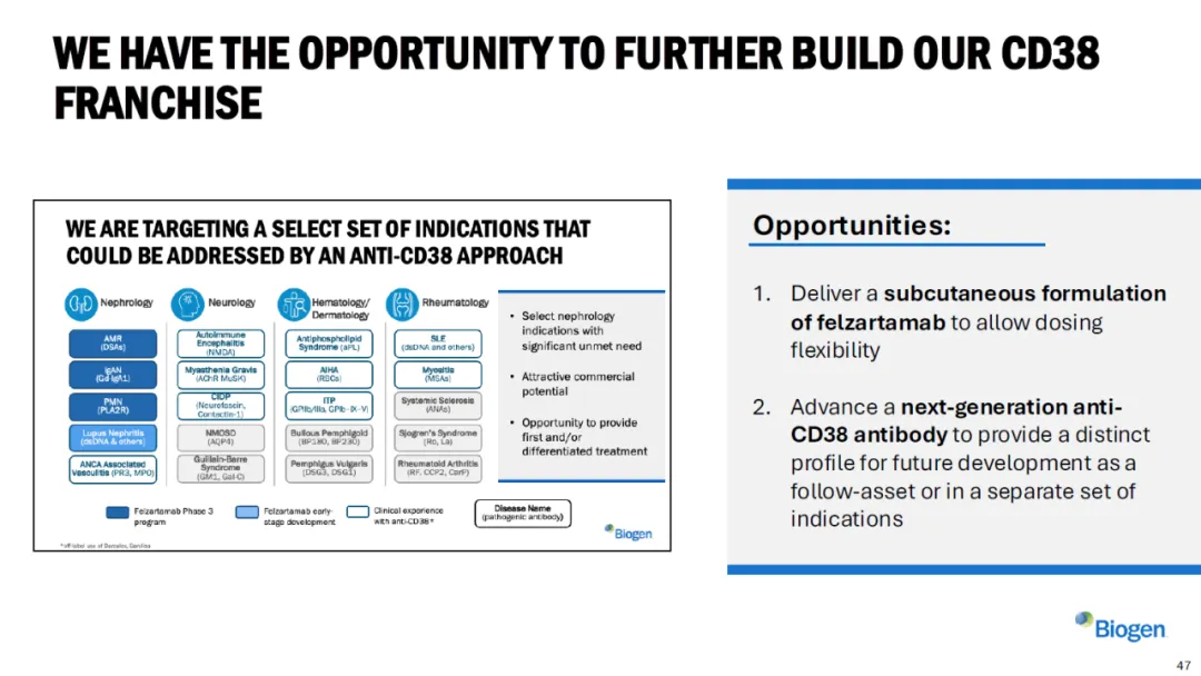 更大的想象空间在于CD38平台的扩展。Biogen正在开发皮下制剂,这将大大提升给药便利性。同时,下一代CD38抗体也在研发中,目标是在保持选择性的基础上,实现更大的商业灵活性和更广泛的适应症覆盖。