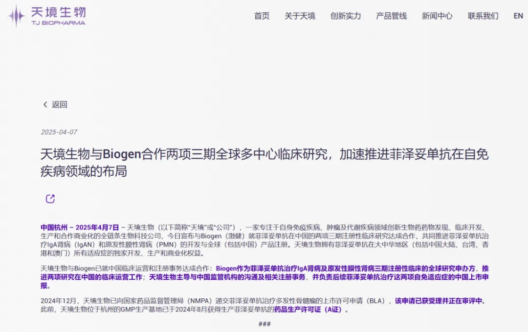 根据公告,天境生物不仅与Biogen共同推进IgAN和PMN的全球三期研究,还负责这两个适应症在中国的监管沟通和上市注册工作。这种安排的精妙之处在于:天境可以利用全球临床数据,同时基于对中国监管环境的深度理解,制定更适合的注册策略。