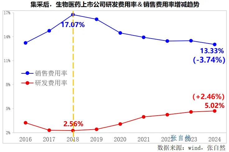 据wind数据统计,在实行集采前,生物医药上市公司销售费用率不断增长,实行集采后,销售费用率逐年下滑,已由2018年的17.07%下降到了2024年的13.33%,6年下降了3.74个百分点。