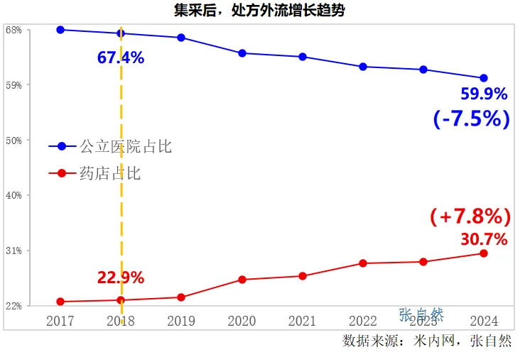 如公立医院的药品采购额在医药终端整体市场规模的占比,由集采之初2018年的67.4%下降到了2024年的59.9%,6年下降了7.5个百分点;