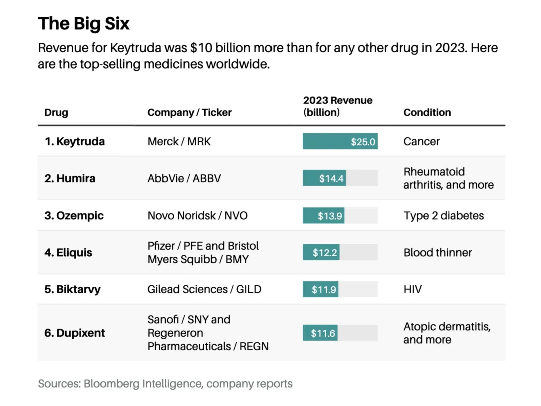 自2014年上市以来,Keytruda凭借其创新的PD-1机制,迅速成为肿瘤免疫治疗领域的明星药物。2023年,Keytruda首次以250.11亿美元的销售额,超过Humira登顶最畅销药物排行榜,标志着肿瘤免疫疗法的里程碑。