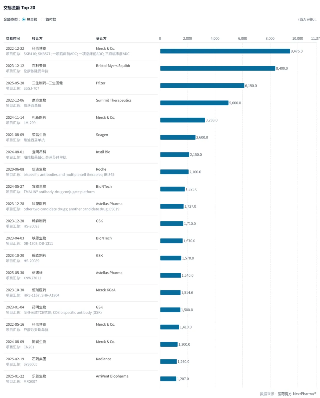 这种“引领”所释放的全球影响力,此前已有先例:康方生物的依沃西单抗就掀起了辉瑞、默沙东、BioNTech等跨国药企对国产PD-(L)1/VEGF双抗的BD热潮。伦康依隆妥单抗的潜力更是在早期就获得了制药巨头的认可——仅凭I期研究数据,百利天恒便成功与BMS签下总金额高达84亿美元的合作大单,这一金额至今仍保持着中国单款药物license-out交易的最高纪录。未来,整个双抗ADC赛道有望迎来新的发展机遇。ADC和双抗/多抗License-out交易TOP20
