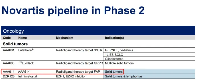 核药龙头诺华已经对FAP进行了一系列布局。通过合作与收购,目前诺华的AAA614(177Lu-FAP-2286)已经处于治疗实体瘤的2期临床,用于诊断的68Ga-FAP-2286也在同步开发中。