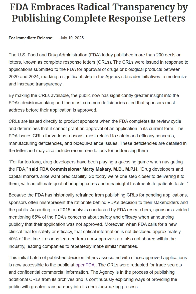 2025年7月10日,美国食品药品监督管理局(FDA)宣布了一项重大举措:首次公开了200多封完整回应函(CRLs),这些信件涉及2020年-2024年间发出的药物/生物制品CRL档案。此举旨在提高监管透明度,减少制药行业的“猜测游戏”,让公众确切知道这些药物被拒绝批准的原因,以便制药企业更快解决审批障碍。